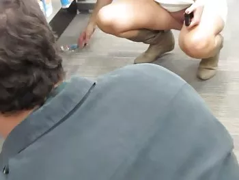 年轻的家伙在厚厚的金发老太太坚持他的公鸡